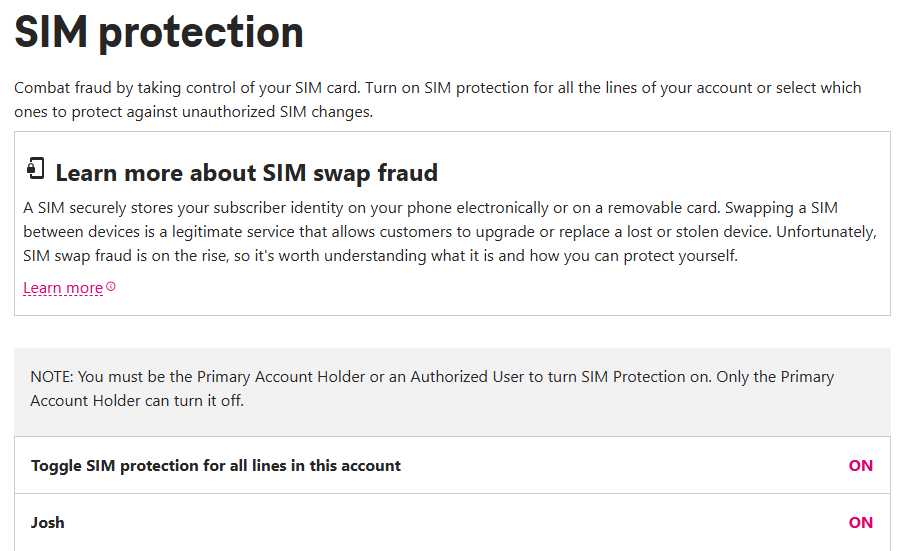 Log into your mobile carrier's website or app. Navigate to “Security” and then toggle “On” for SIM Protection. This prevents someone from “swapping” your eSim without your permission. It will look something like this (see below). Then, as a secondary step, request via your phone carrier that only in-person SIM card adjustments are allowed.